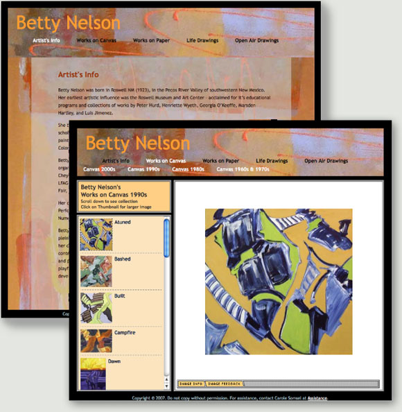 I photographed and categorized the art, optimized the images for web, wrote the biography, created the site design, graphics, and user interface, wrote the html and css code and optimized the site for search.